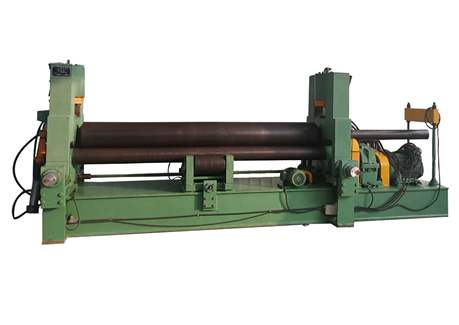 上輥萬能卷板機屬于液壓型三輥卷板機,用于常溫狀態下將板材卷成圓筒形、圓弧形、圓錐形。上輥可以垂直移動、水平移動。上輥垂直位移采用液壓傳動,水平移動采用機械移動。具備板端彎功能,通過上輥水平移動,使上輥相對于下輥呈非堆成位置來實現板端頂彎。圈圓時通過電動機、減速機帶動兩下輥進行。由于下輥的標高不變,所以便于進料和操作。翻倒架采用液壓翻倒。采用PLC可編程顯示器控制,數字顯示操作,操作簡便直觀。